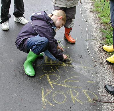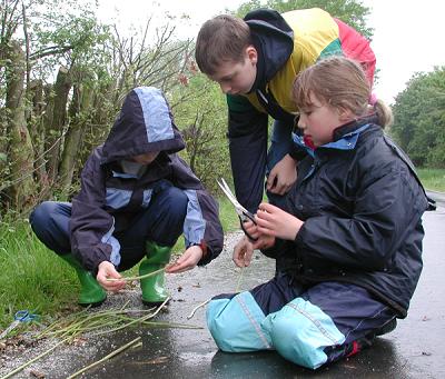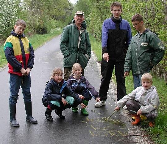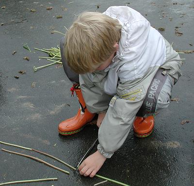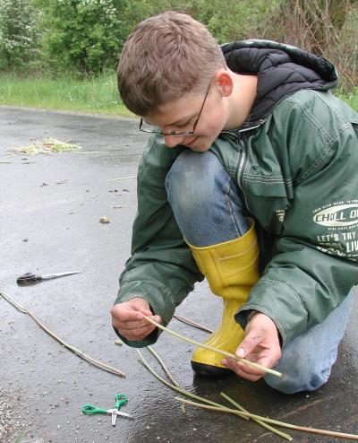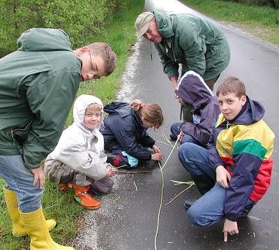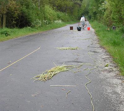 Es regnete schon wieder, als wir uns am 22. Mai 2005 um 10 Uhr am Freibad in Wehrheim trafen. Die Löwenzähne waren schon alle zu Pusteblumen geworden, aber dafür waren die Stängel ziemlich lang und wir hätten fast noch einen Wettbewerb veranstalten können: Wer findet den längsten Löwenzahnstängel? Aber wir wollten ja eine superlange Löwenzahnpipeline bauen und mussten also erstmal fleißig sammeln. Zum Glück hörte es bald auf zu regnen und wir machten uns an den Bau der Pipeline, manchmal war es gar nicht so einfach, den passenden Stängel für den Anschluss zu finden. Zu dünn, zu dick, zu krumm, schon geknickt... |