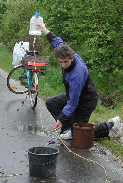 Oliver war zuständig für den ständigen Wasserfluss. Hier haben wir ein ganz tolles Hilfsmittel bekommen, ein medizinisches Schlauchsystem mit einem Beutel dran, da konnten wir prima einfüllen und den Schlauch in den ersten Löwenzahnstängel stecken und schon war die Wasserversorgung gesichert. Später hängten wir den Beutel einfach an den Fahrradlenker (sozusagen unser "Infusionsständer"), da war es noch einfacher. |