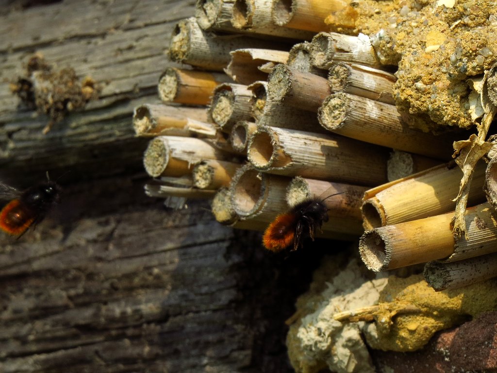 Mauerbienen (Osmia cornuta) an der Wildbienenwand auf den Binsenwiesen