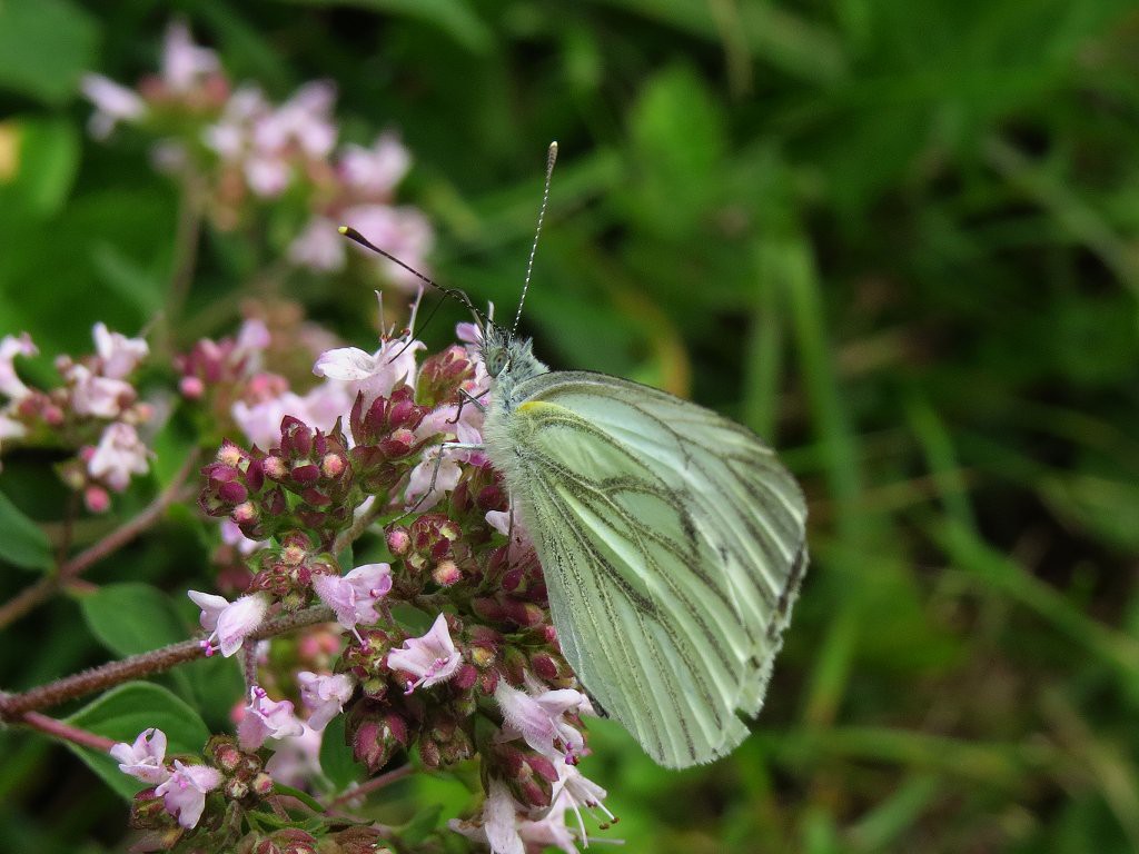 Viele Weißlinge, auch dieser Grünaderweißling, flattern derzeit zahlreich von Blüte zu Blüte | |||