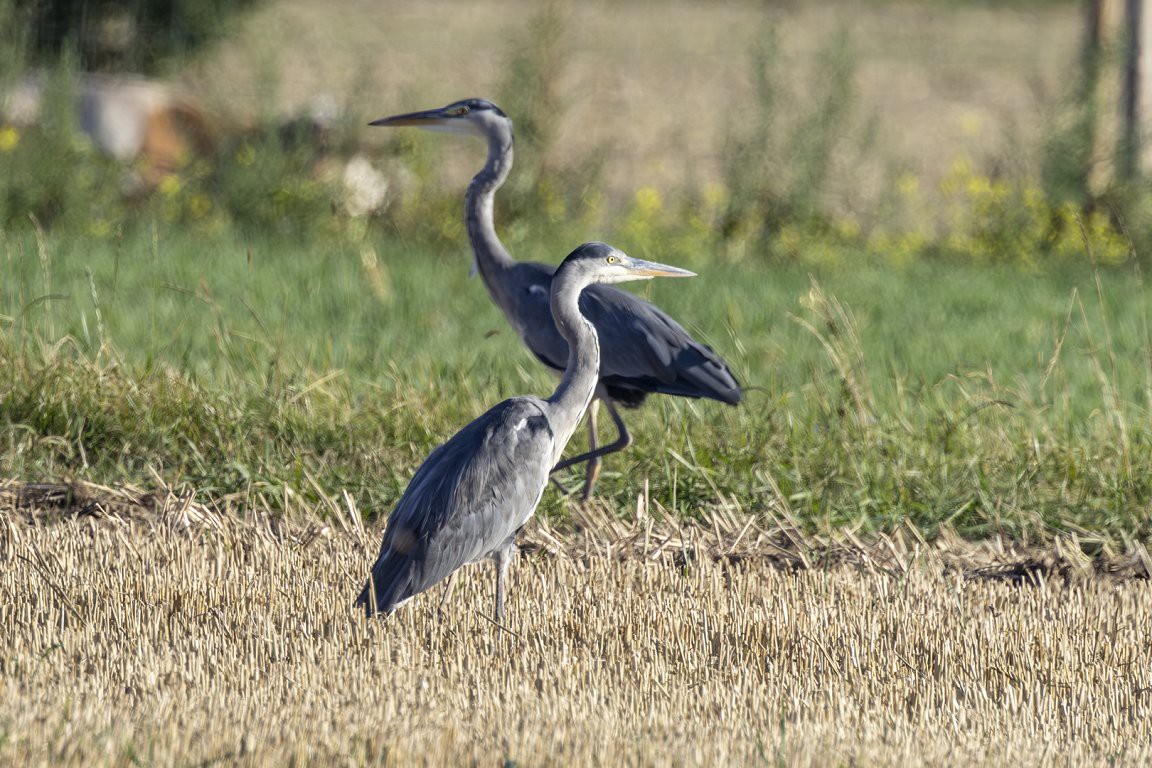 Auf einem Stoppelfeld Nähe Niedernhainer Hof zwei (von vier) Graureihern