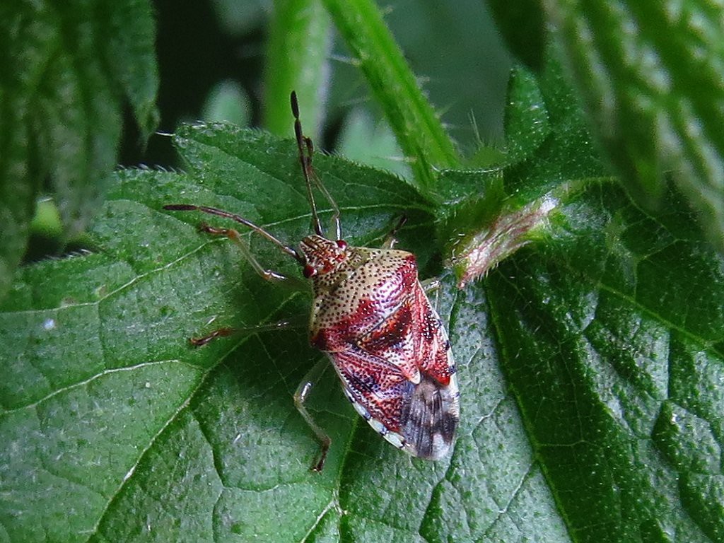 Fleckige Brutwanze (Elasmucha grisea), auch Birkenwanze genannt, auf Brennnessel im Feldgehölz Wolfskehl | |||