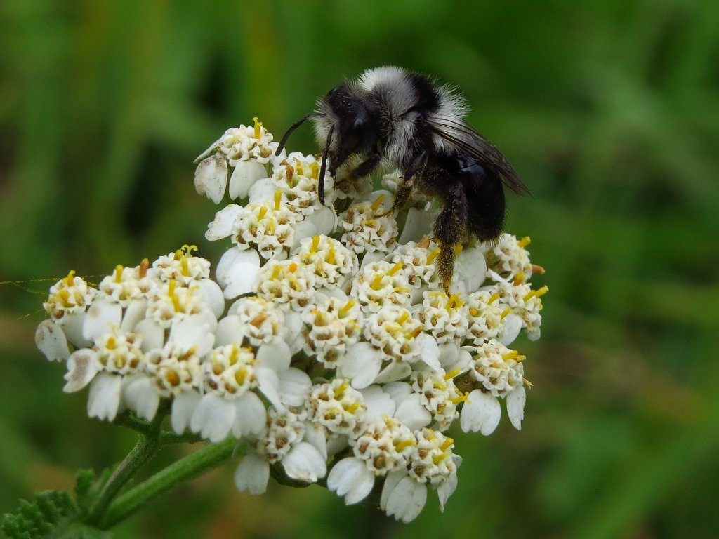 Grauschwarze Düstersandbiene (oder Graue Sandbiene) auf Schafgarbe auf een Auwiesen, ist eigentlich so spät nicht mehr unterwegs | |||