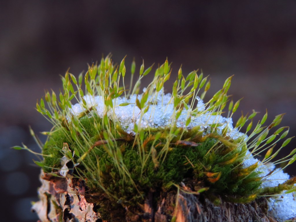 Lockiges Gabelzahnperlmoos (Dicranoweisia cirrata) auf dem alten Pfosten im Auwiesentümpel erlebt den ersten Schnee in diesm Herbst | |||