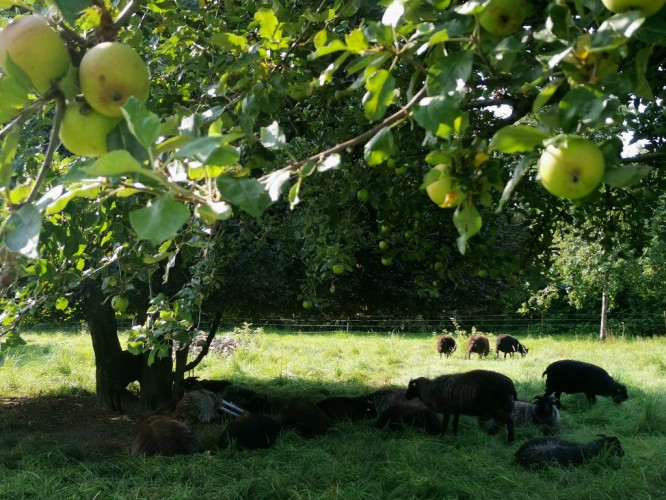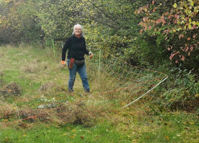 Wir haben vier junge Bäume bzw. Sträucher gepflanzt: Sanddorn, Eberesche, Hasel und Esche. Zwei Jungpflanzen wurden in bereits bestehende Schafschutz-Vorrichtungen integriert; für zwei weitere wurden sie neu errichtet. Bei mehreren Apfelbäumen haben wir Wassertriebe entfernt.