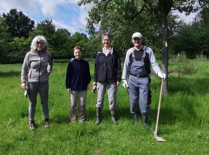 Mit Hacke und allen zur Verfügung stehenden Schneidwerkzeugen rückten wir ihnen zu Leibe, da sie sonst in kürzester Zeit die gesamte Wiese "erobern" würden und andere Pflanzen kaum noch eine Chance hätten. Außerdem wurden die Steinhaufen von aufkommendem Bewuchs befreit. Die Apfelernte wird 2020 eher dürftig ausfallen, aber die Birn- und Mirabellenbäume tragen reichlich Früchte.
